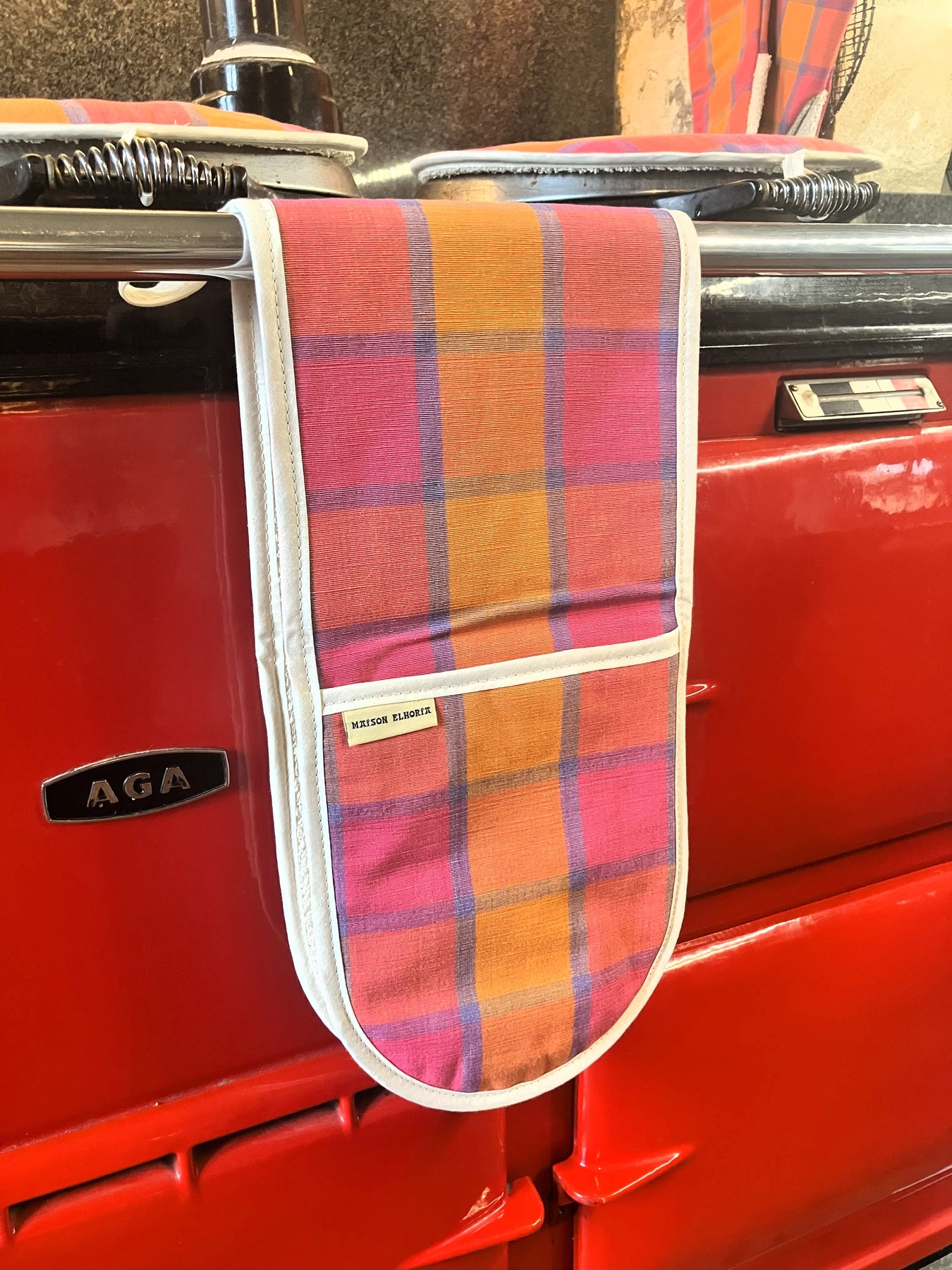 Our oven gloves are carefully designed with an inner towelling lining that provides comfortable heat resistance to safely handle hot dishes. However, please note that the outer decorative fabric is not chemically treated with additional fire-retardants. While these gloves are suitable for regular oven use, prolonged or direct contact with heating elements, open flames, or extremely hot oven surfaces may cause scorch marks or fabric damage. For best longevity appearance, take care to minimize prolonged contact with metal oven shelves or heat sources.